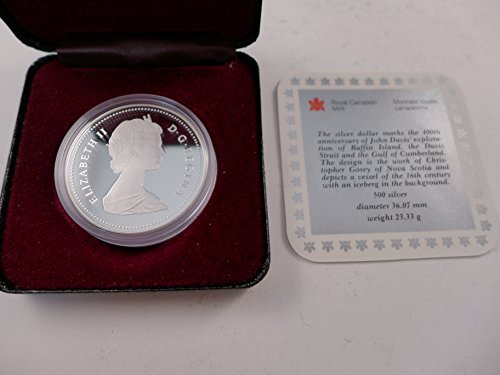 1987 Royal Canadian Mint Commemorative Silver Dollar to celebrate the 400th anniversary of the exploration of Baffin Island, the Davis Strait and the gulf of Cumberland. Weighs 23.33 grams of .500 fine silver. Comes encapsulated in plastic with the original box and COA.